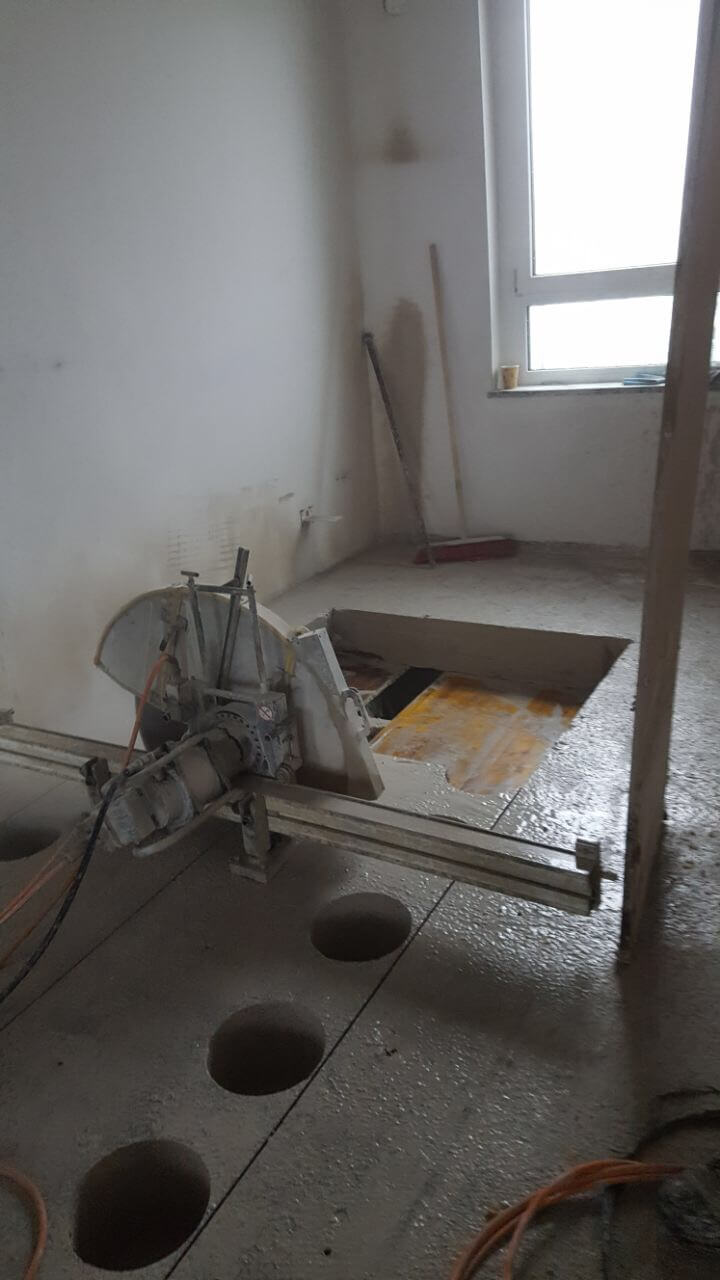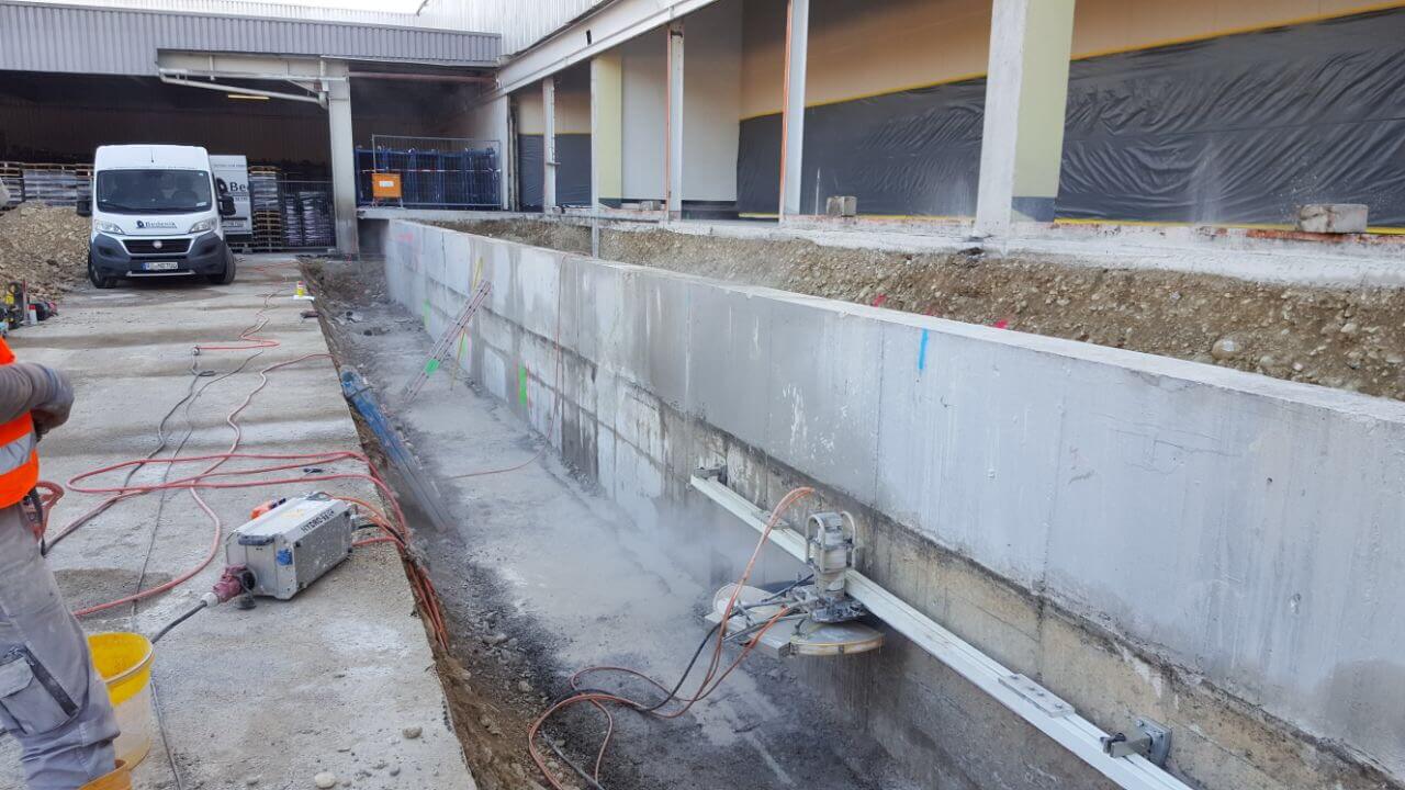 Mit dem Fugenschneider werden Schnitte in Böden und Decken mit einer Dicke von bis zu 53cm durchgeführt. Bei diesem Verfahren können Beton, Asphalt, Stahlbeton und Fließen geschnitten werden.